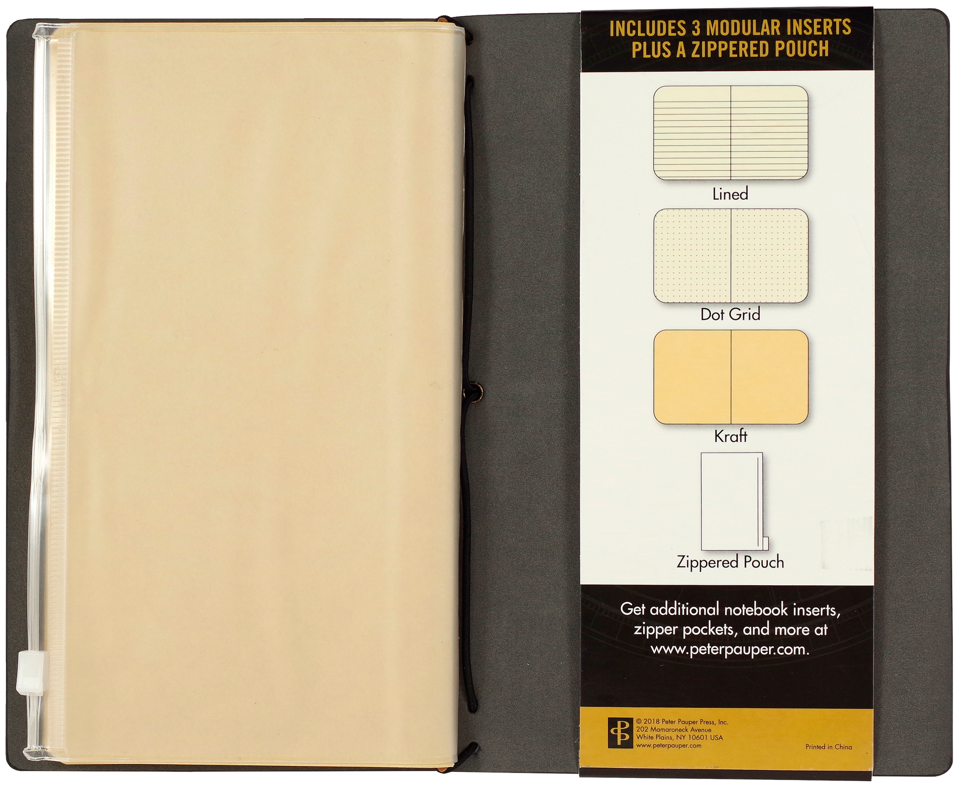 Versatile Voyager Notebook is perfect for journaling, sketching, note-taking, and creative planning on the go! On the outside: A durable, flexible faux leather cover. On the inside: 3 separate 60-page notebook inserts: A Lined Pages insert A Dot-Grid/Dot Journal Pages insert A blank Kraft Paper Pages insert Plus: A clear storage pocket inside the front cover. A clear zippered storage pouch inside the back cover. Interior stretchbands, elastic closure, and protective front-edge flexi-tab to keep it all together. Premium 80 gsm paper supports pen or pencil. Paper is acid-free and of archival quality. Notebook is accented with a bronze barrel bead with incised ''s'' pattern Voyager is compatible with most modular notebook refills. <