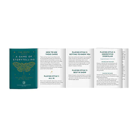 From the storytelling experts at The Moth, this interactive card game encourages lively conversations, sparks creativity, and improves public speaking abilities. Players draw a card and share their own true story based on themes including Love Hurts, Mama Rules, Busted, Hot Mess, Chemistry, Duped, and dozens more. 100 cards, each with multiple prompts, plus instructions for multiple ways to play.