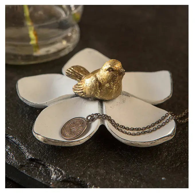 Perfect for rings and earrings or small necklaces, our bird jewelry/coin holder features a gold leaf bird atop a distressed white flower petal. Dimensions: (4.25" x 4.25" x 1.75")